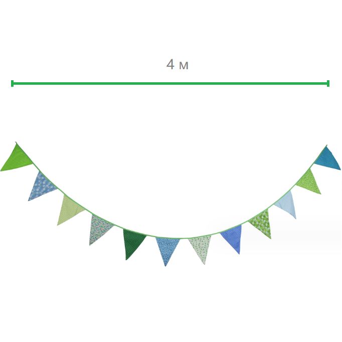 Гирлянда состоит из 12 флажков, расстояние между флажками 6 см, общая длина составляет 4 м.