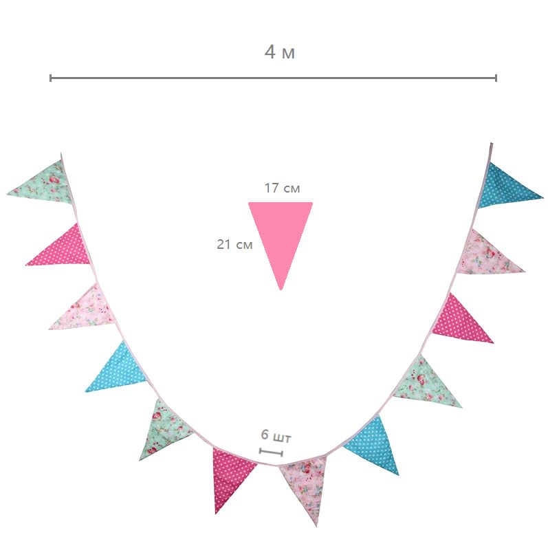 Гирлянда состоит из 12 флажков, расстояние между флажками 6 см, общая длина составляет 4 м.