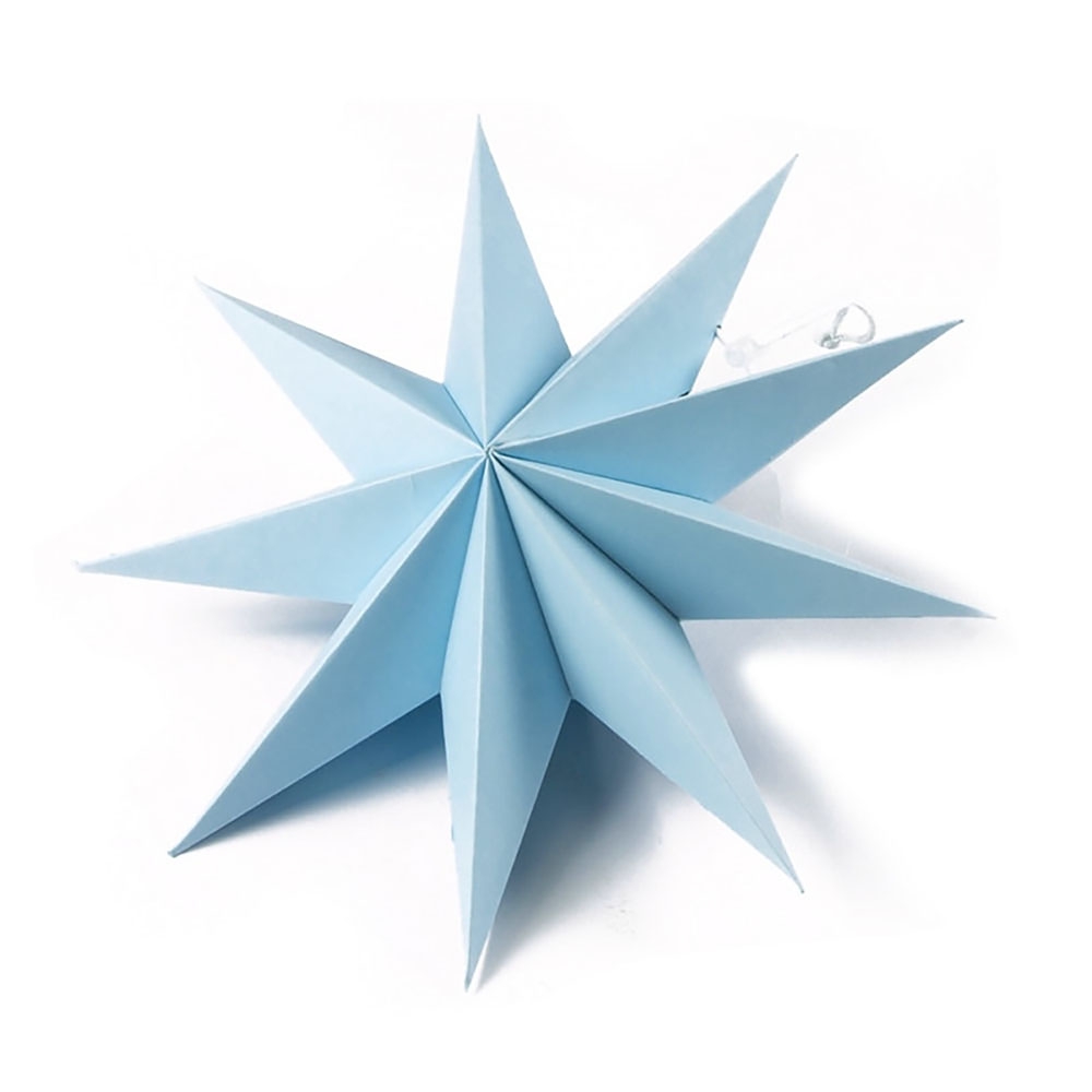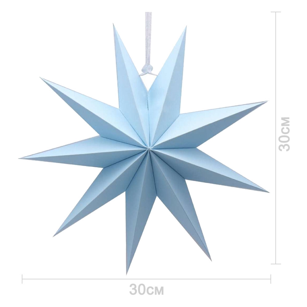 Объёмная декоративная звезда из картона диаметром 30 см с 9 лучами. Оснащена встроенным шнурком для подвешивания. Поставляется в компактном сложенном виде и быстро собирается: специальный шнурок при затягивании придаёт изделию объём и фиксирует форму. После сборки звезда остаётся устойчивой без дополнительных креплений и может использоваться многократно.